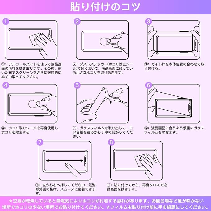 【専用のガイド枠】専用のガイド枠付きで、正確な位置に完璧に貼り付けることができます、保護フィルムの接着面は特殊な自動吸着層を使用しているので、ガラスを液晶に置くだけで自然に吸着し、気泡が出来にくいので、 誰でも簡単、綺麗に貼ることができます。