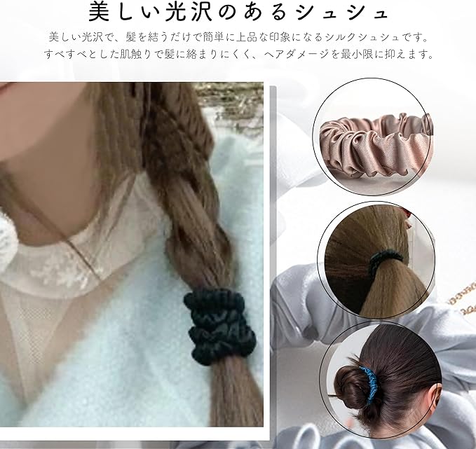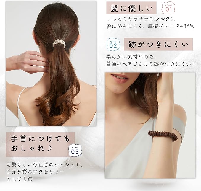 ★【シルクのヘアゴム】★シルクは髪に絡みにくいので、外すときにも痛みを感じにくく、 髪への負担が少ないため、髪を傷めることなく髪をまとめることができます。 まとめていても髪の毛に跡がつきにくいので、寝る時やちょっとしたときに髪をまとめるのに便利。