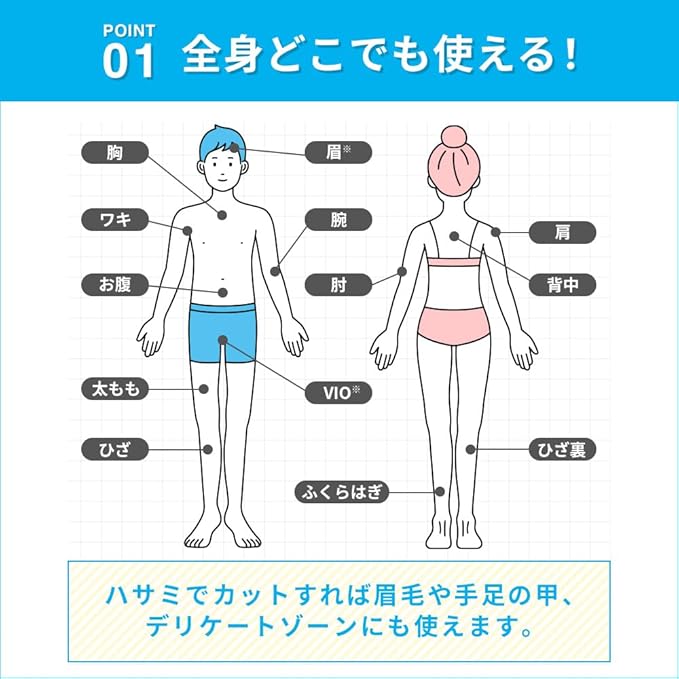 ⭐【全身どこでも使える】ハサミで好きなサイズにカットして、気になる場所どこにでも。ふくらはぎや腕はもちろん、眉毛や手足の甲、デリケートゾーンにも。