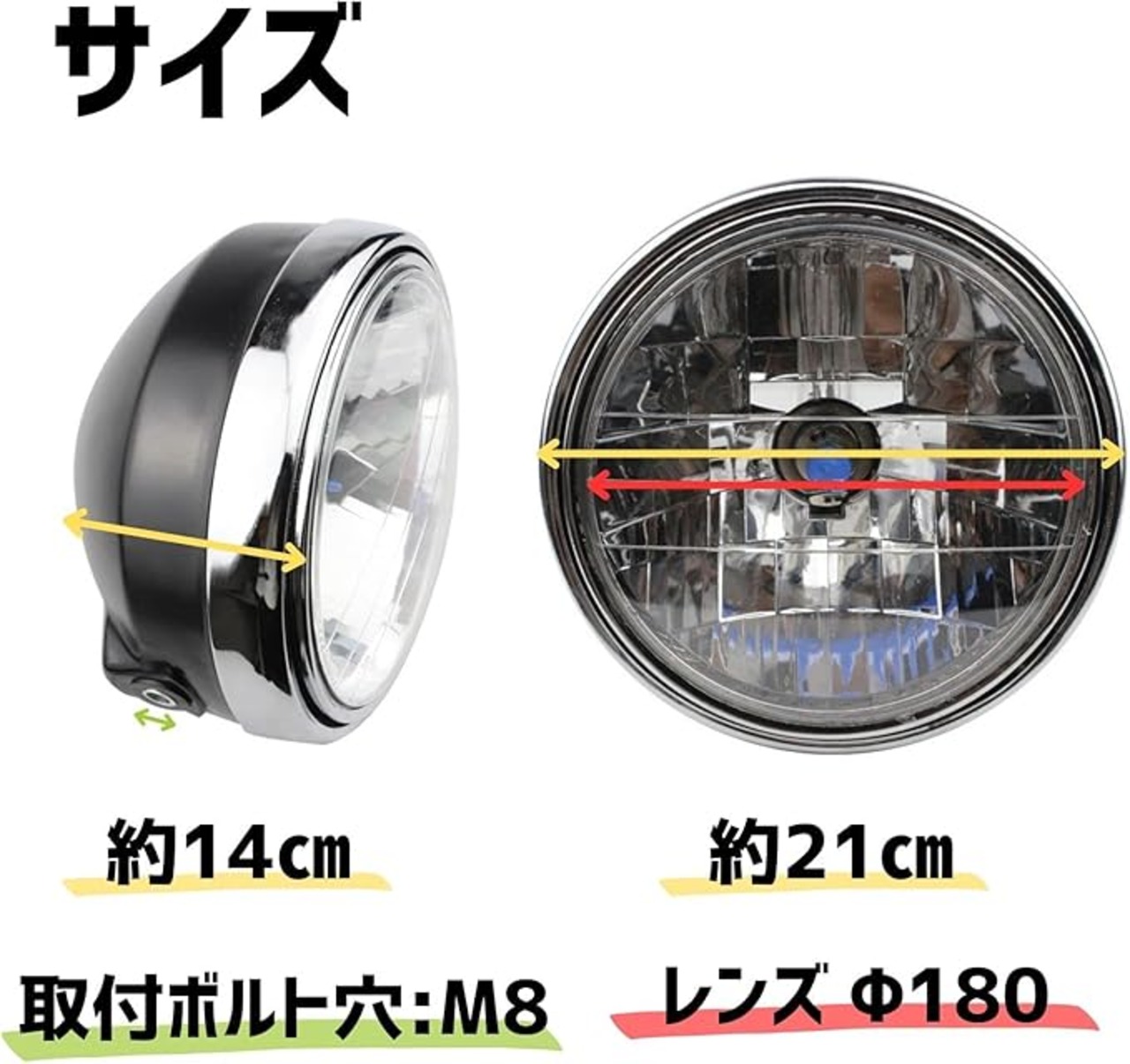全体サイズ: 直径 約 21cm 奥行き 約 14 cm / 取り付け部ボルト穴:M8 レンズ径:180パイ