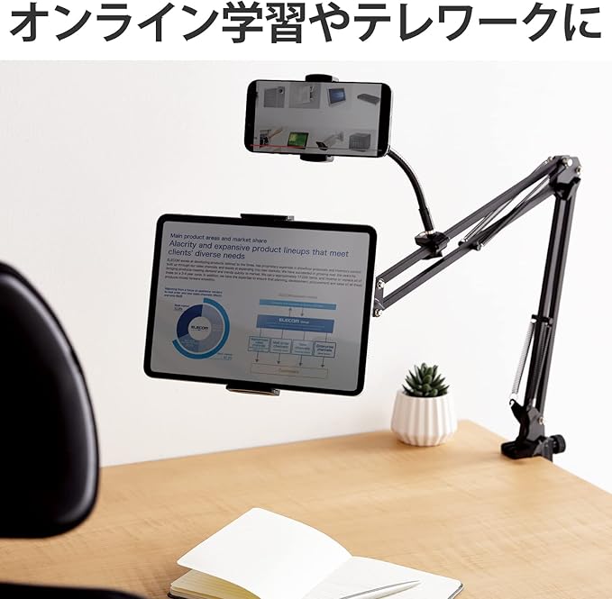 ■スマートフォンやタブレットを1台ずつ設置できるフレキシブルアームスタンドです。