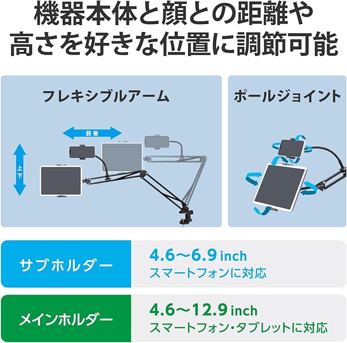 ■メインホルダーは4.6~12.9インチのスマートフォンやタブレット、サブホルダーは4.6~6.9インチのスマートフォンに対応しています。