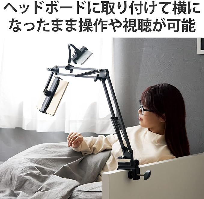 ■横方向に固定するとテーブルなどに取り付けて使用でき、縦方向に固定するとベッドのヘッドボードなどに取り付けられるので横になった状態でも使用できます。