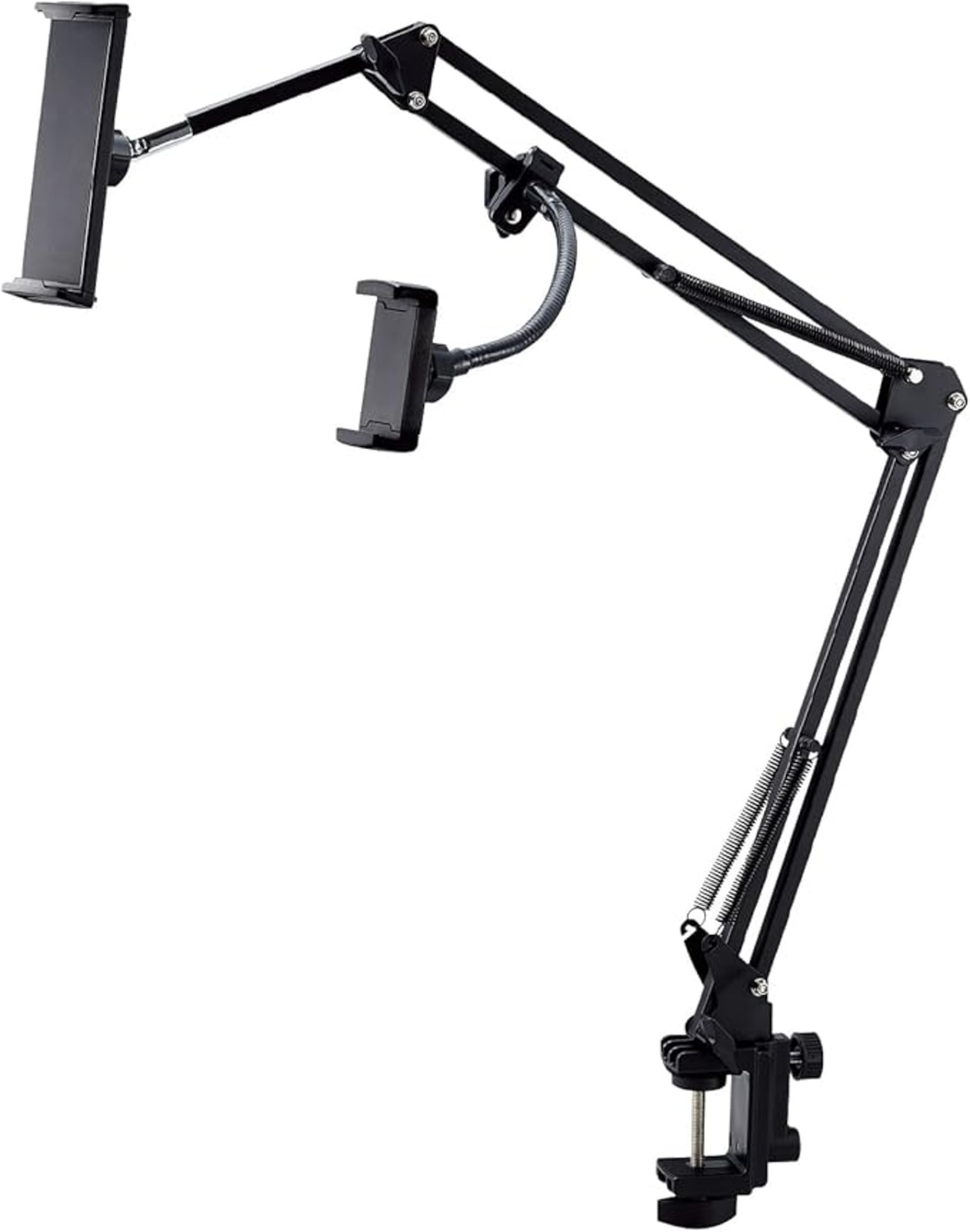 スマートフォンやタブレットを1台ずつ設置できるフレキシブルアームスタンドです。