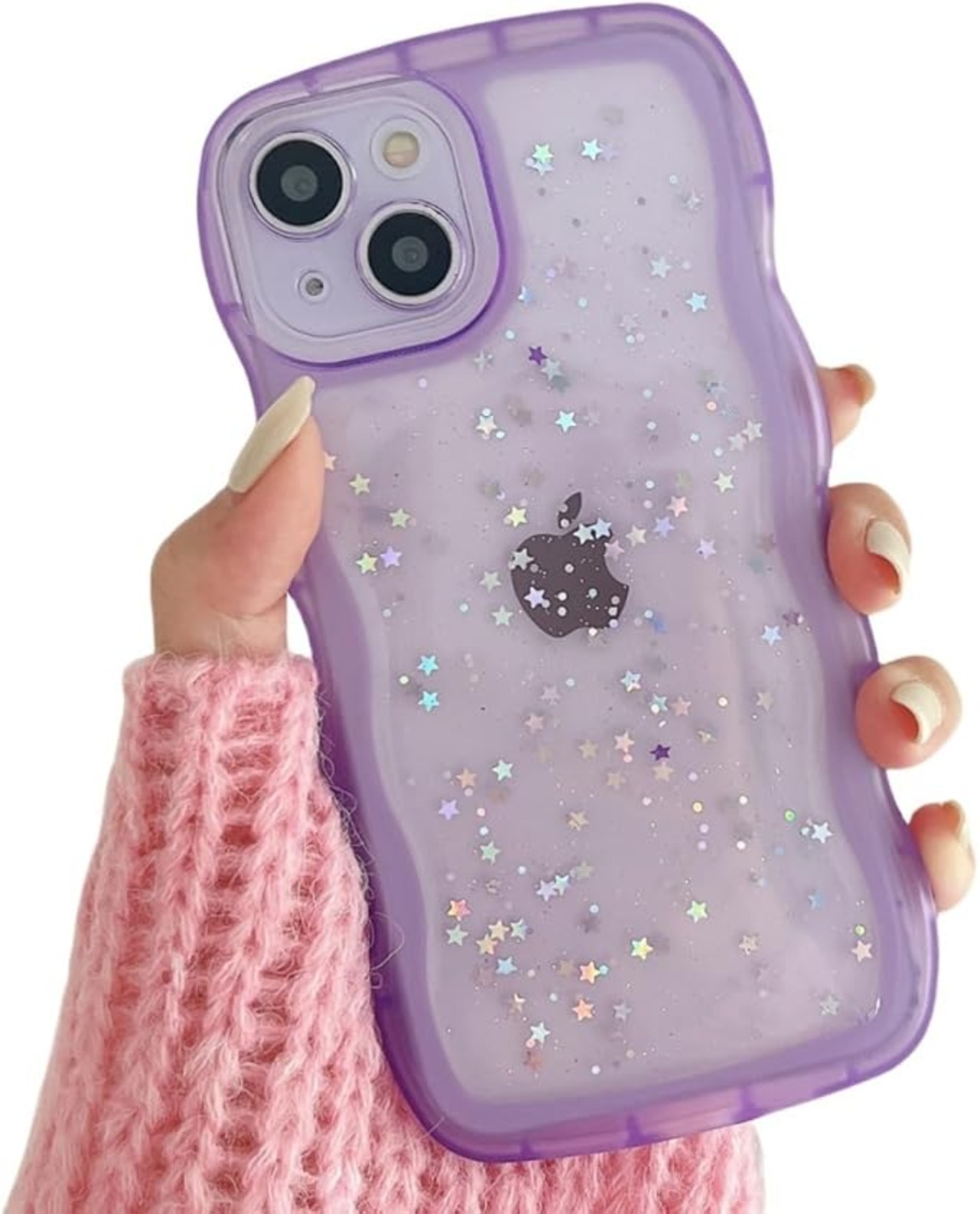 きらきら iPhone15 ケース クリア 透明 ラメ入り 星 キラキラ ウエーブ 波型フレーム かわいい アイフォン15 カバー 大人 可愛い デコレーション 女性 人気,紫