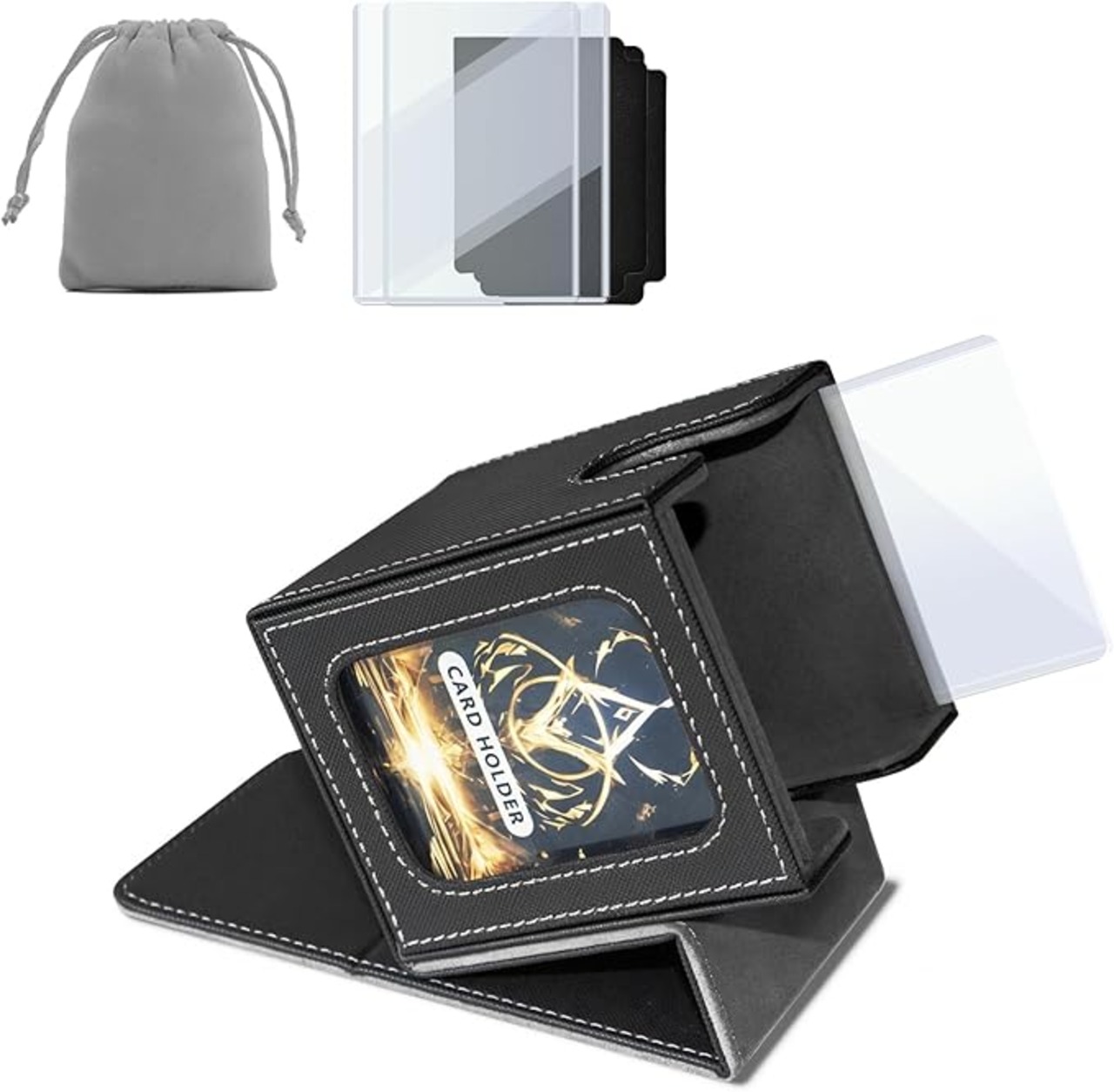 Domstar デッキケース、カードケース トレカ、ダブルカードディスプレイウィンドウ付き、防水革製、100枚のダブルスリーブカード収納可能、2つの仕切り、2つのカードスリーブ、1つのサイコロ袋付き、ポケモン、遊戯王、デュエルマスターズなど対応 (黒と灰)