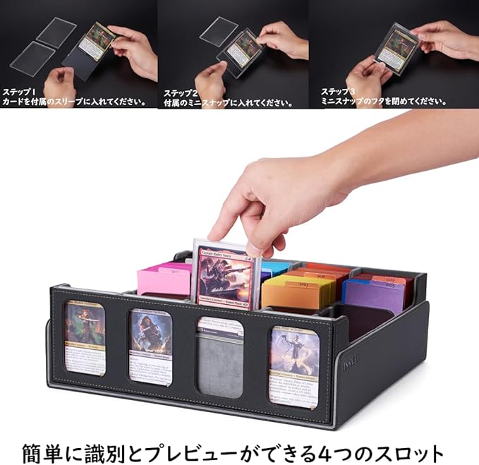 【プレビューできる窓】このトレカ収納ボックスは、片側に4枚のカードを展示するためのスロットがあり、ボックスを区別しやすく、内容をプレビューすることができる。各カードにはミニスナップとスリーブが付属している。