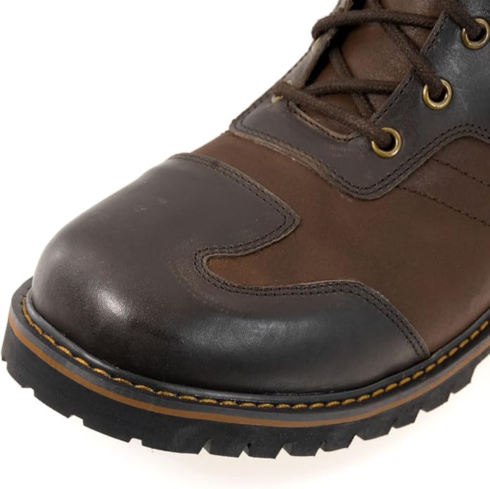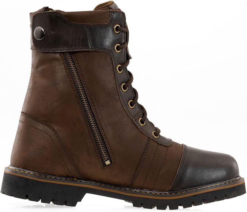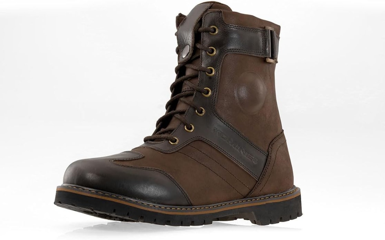 タフなルックスのライディングブーツ。丈夫でお手入れ簡単なマイクロファイバーをメインに使用し、くるぶしのプロテクターや牛革製のシフトパッチも装備。
