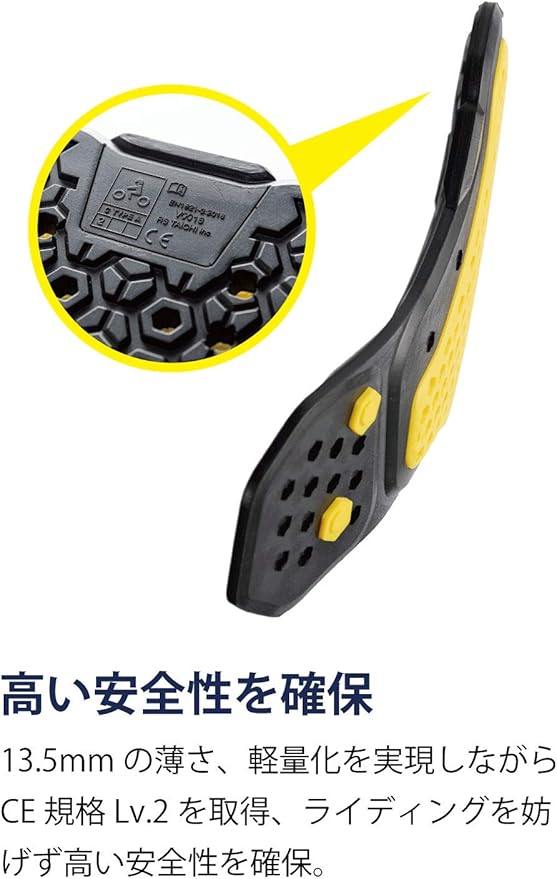 軽量ながらCE規格 Lv.2をクリアする安全性能。厚さ13.5mmの薄型設計。肌側には高い通気性を確保するヘリンクス構造を採用。レザースーツのフィット感に応じて調整可能なアンチスリップバンドを採用。
