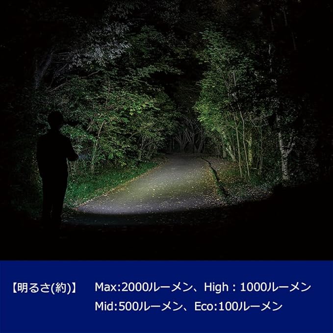 明るさ:Max/2000ルーメン、High/1000ルーメン、Mid/500ルーメン、Eco/100ルーメン、使用電池:専用充電池