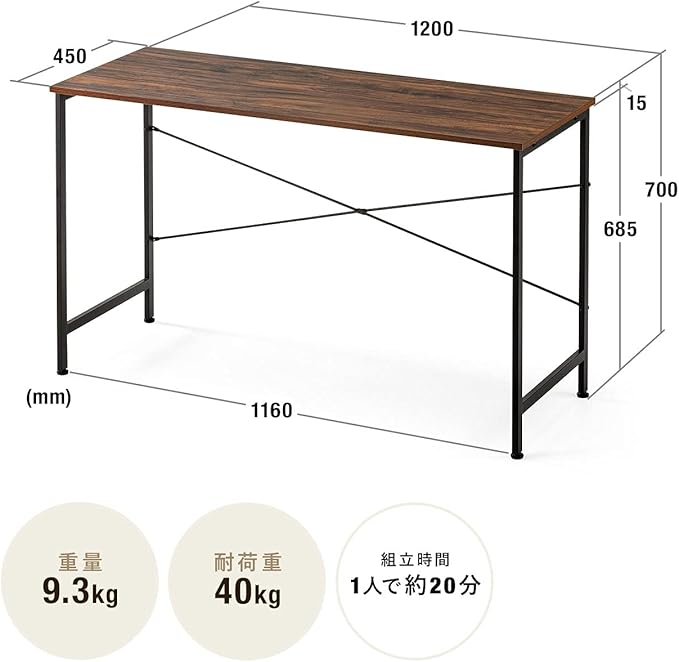 ●横幅120cm、奥行45cm、高さ70cmのシンプルデスクです。