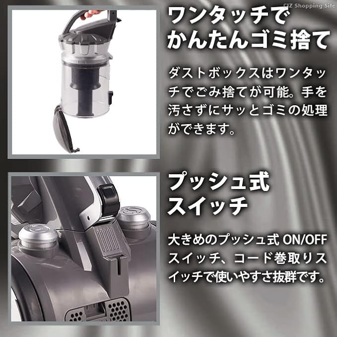 スタイリッシュなデザインで吸引力抜群のサイクロン掃除機です。 ダストカップを取り外してワンタッチでゴミ捨ても楽々。紙パックは不要です。 コンパクトで収納に場所をとりません。ダストボックス部にはクリーンフィルター本体排気口にはお手入れが楽なスポンジフィルターを採用。 汚れてもサッと水洗いできるのでいつでもクリーンな排気。 フローリング、じゅうたん、切り替えフロアーブラシ、すき間&ブラシノズル、ホコリ取りノズル等充実のアタッチメントであらゆるシーンで大活躍