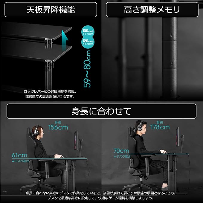 【身長に合わせて】身長に合わない高さのデスクで作業をしていると、姿勢が崩れて肩こりや腰痛の原因となることも。デスクを最適な高さに設定して、快適なゲーム環境を構築しましょう。