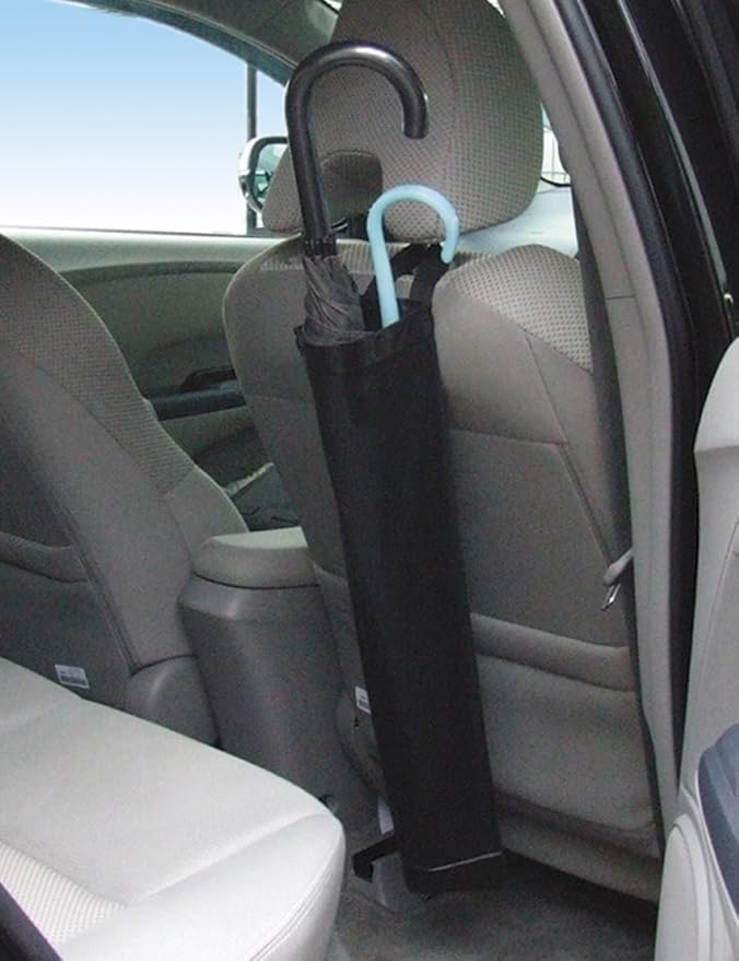 カサをらくらく2本収納可能。 使わない時は、丸めてコンパクトに折り畳み可能。 ヘッドレストにぶらさげたり、グローブボックスの中にすっきり収まるサイズ。