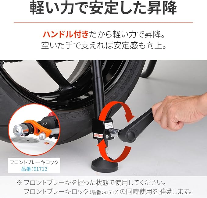 ※ スタンド使用中はフロントブレーキは握った状態を保持してください。デイトナ製「フロントブレーキロック(品番:91712)」の同時使用を推奨します。