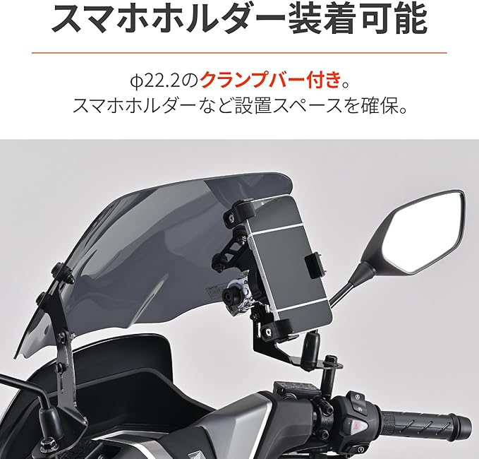 φ22.2mmのクランプバーでスマホホルダーなど装着可能