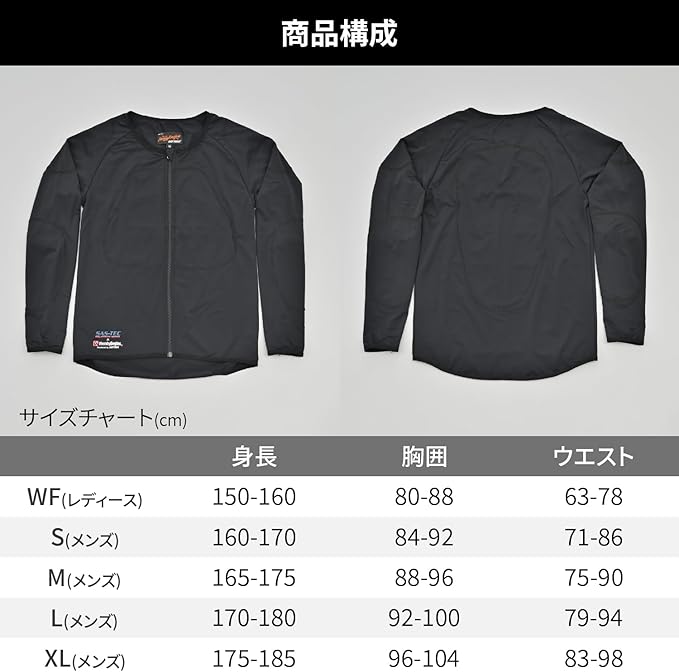※ ご自身の体にフィットするものをお選びください。サイズが合っていないウエアを着用されますと、プロテクション効果が充分に発揮されない場合やライディングに支障をきたす場合もあり非常に危険です。