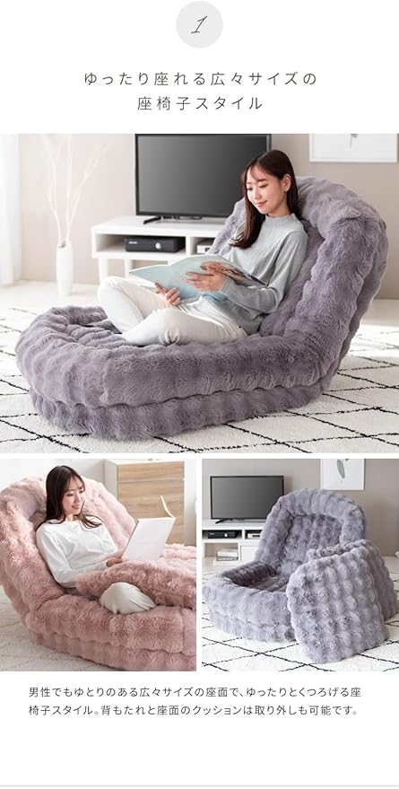 男性でもゆとりのある広々サイズの座面で、ゆったりとくつろげる座椅子スタイル。背もたれと座面のクッションは取り外しも可能です。