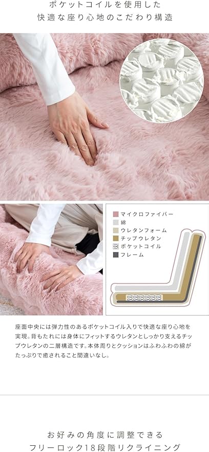 ポケットコイルクッション:座面中央には弾力性のあるポケットコイル入りで快適な座り心地を実現。背もたれには身体にフィットするウレタンとしっかり支えるチップウレタンの二層構造です。本体周りとクッションはふわふわの綿がたっぷりで癒やされること間違いなし。