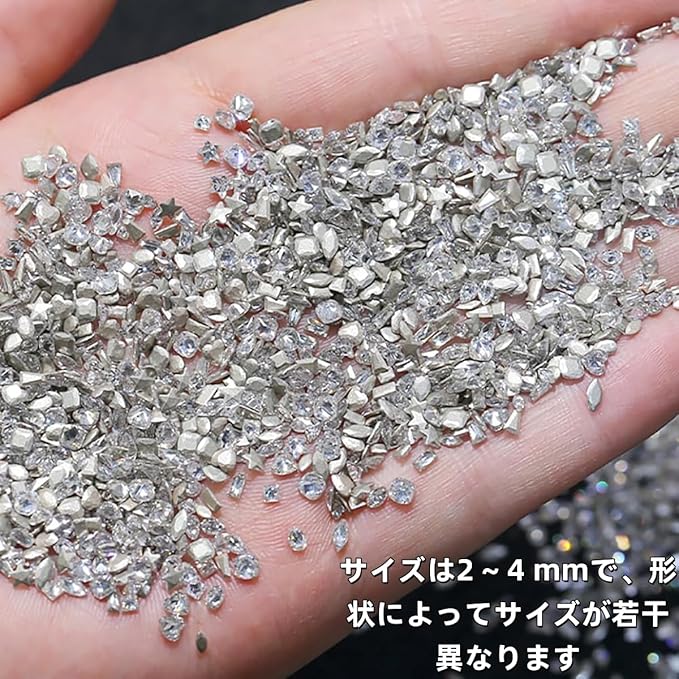 【仕様】:ネイルパーツ約150個入りで、複数の異なる形状のパーツを含み、1つのサイズは2 ~ 4 mmである。