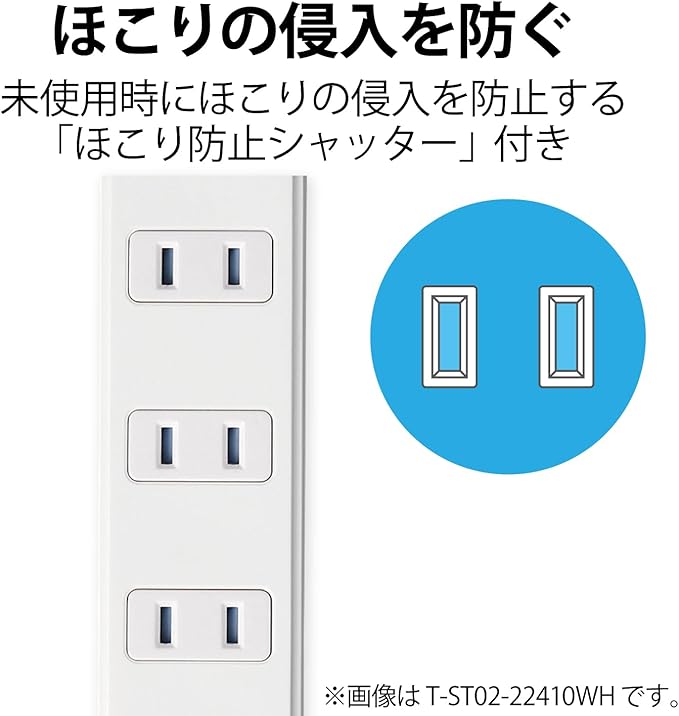 未使用時にほこりの侵入を防止する「ほこり防止シャッター」付き。オフィスやご家庭など、さまざまなシーンで使いやすいほこり防止シャッター付電源タップ。