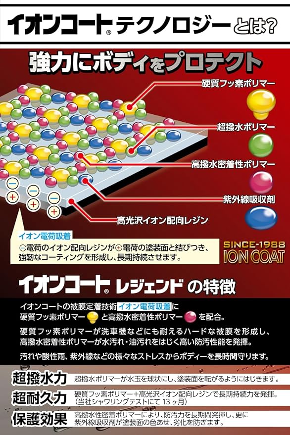 ●高撥水密着性ポリマーを新たに配合し、撥水性・防汚力アップ ●洗車機を20回連続使用しても塗布直後の状態の水玉コロコロをキープ ●当社耐久撥水テストによる耐久性も驚きの13 ヶ月持続