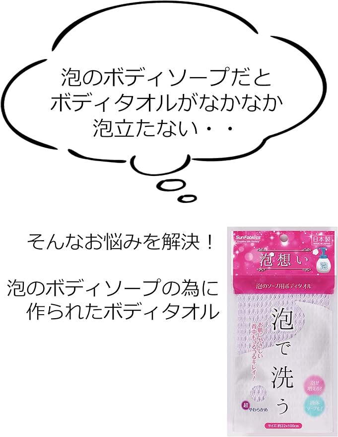 パターン(種類):ボディソープ用 パープル 超やわらかめ 【商品特徴】 ●泡のボディソープの泡を増やす事で、たっぷりの泡で全身優しく洗えます。●液体のボディソープでもたっぷりの泡を生み出します。●とてもやわらかな肌ざわりで、余分な皮脂や汚れをやさしく落とします。●軽量の繊維を使用していますので、水を含んでも重くなりにくく使いやすいタオルです。【+AY25使用上の注意】 ●お肌は、同一箇所を余りにも強く、長時間こすりすぎると、まれに肌をいためたり、色素沈着が起きるという症例が報告されています。●顔等、皮膚のやわらかい部分のご使用は十分ご注意して下さい。●お肌の弱い方、乳児、幼児、アレルギー体質の方及び肌に異常のある時はご使用お避け下さい。●ご使用しているうちに、サイズは多少収縮する場合があります。●ご使用後はよくすすいで乾かして衛生的にお使い下さい。●洗濯機、漂白剤、乾燥機はご使用にならないで下さい。●火のそばや、高温になる場所には置かないで下さい。●体洗い以外の目的には使用しないでください。●ご使用になるボディソープにより泡立ちに差が出る事があります。