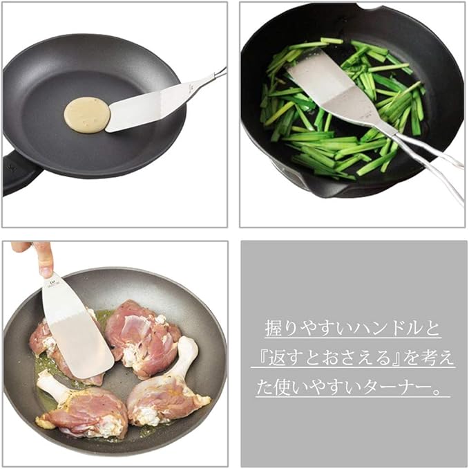 ●食材を返すだけではなく、身が縮んで反りかえりやすい食材(肉や魚)を押さえるのにも便利なターナー
