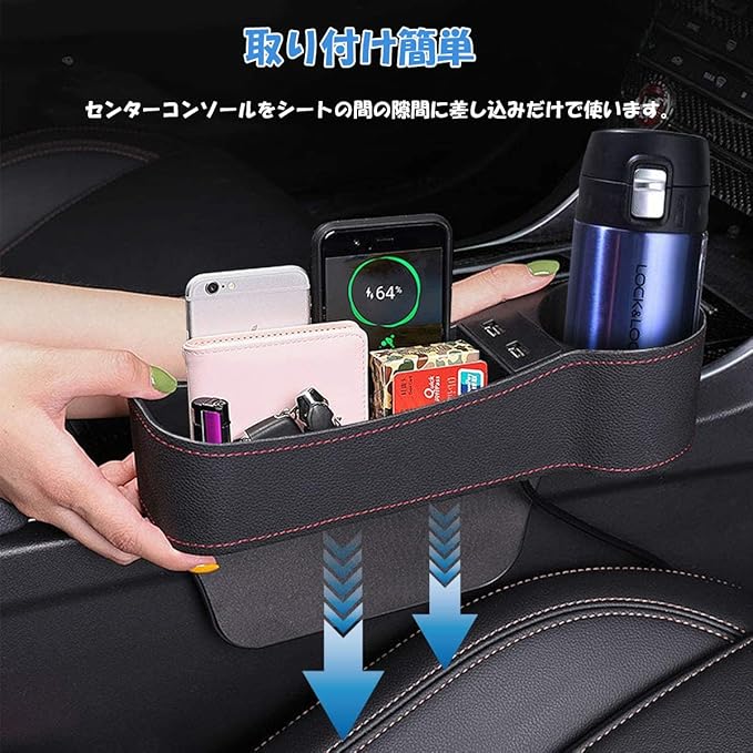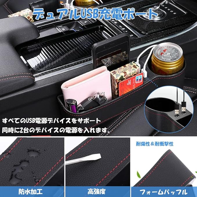 ドリンクホルダー 車用 Yartar コンソールボックス 車隙間収納 シートポケット 2USBポート付き サイド収納ボックス 隙間 差し込み カップホルダー カー用品 PUレザー シートサイド 収納ボックス 運転席で使用 右席