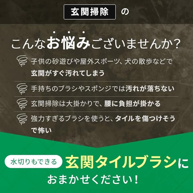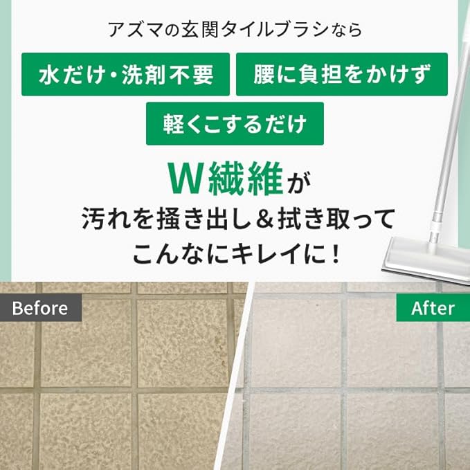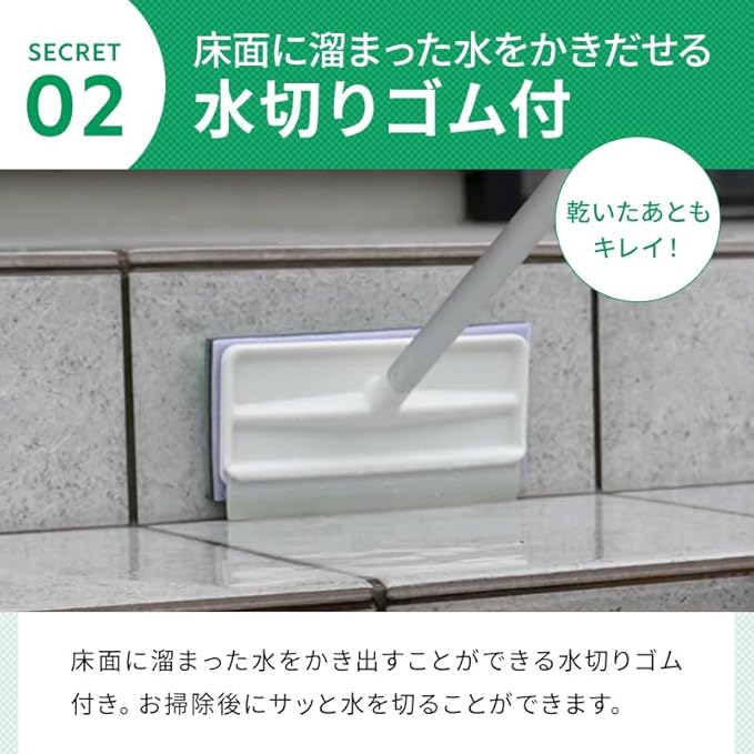 ●洗剤いらずブラシ 水で濡らしてこするだけ ! !●ダブル繊維がタイルの表面やコンクリート外壁などの表面の凹凸に入り込んで汚れをかき出します。●フロアに溜まった水をかき出すことができる水切りゴム付き。 お掃除後もサッと水を切ることができます。