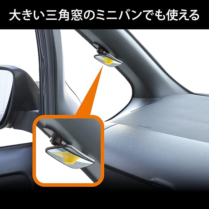車両のAピラーに貼り付けることで、フロントタイヤ付近の死角を確認する事がでる補助ミラーです。運転席側、助手席側どちらにも取り付け可能です。フロントクォーターガラスのない車でも、隣斜線の車や歩行者/自転車を見るためや、車内を見るためのミラーとして使用できます。