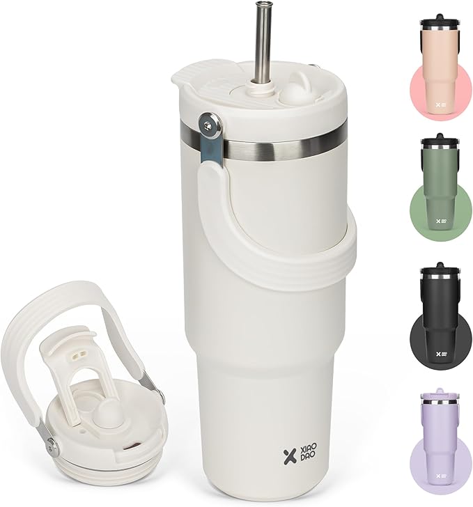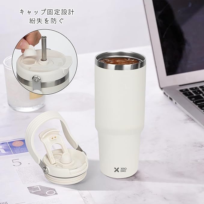 SKIASE タンブラー ストロー付き 900ml 水筒 大容量 ウォーターボトル 真空断熱 保温 保冷 ステンレスボトル 広口 直飲み 蓋付き アウトドア 取っ手付き 持ち運び こぼれない ホワイト