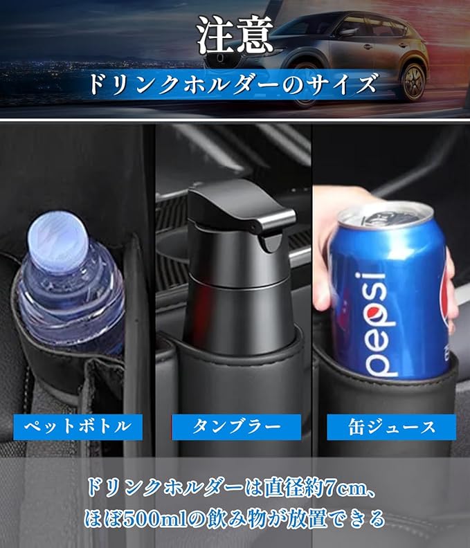【カップホルダー付き&省スペース設計】このリンクカップホルダーは、直径7cm以内までのドリンクボトル(約500ml)のみ収納可能ですので。シートサイドポケットが大容量な収納スペースがあるので、車内の物をきちんと収納でき、車内を清潔に保ち、必要な時に必要な物をすぐに見つけることができます。
