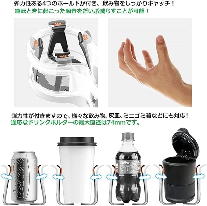 【コップなどを固定可能】ドリンクホルダーに4点ホールド付き、4つの方向から載せる物を包むように支える構造で、運転中でもコップなどをしっかりとキャッチ!運転際に起こった騒音をだいぶ減らすことができます。ものを取り出すのは簡単で便利!