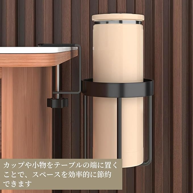 【クランプ取付】 このドリンクホルダーはテーブルに穴を開ける必要がなく、木製、ガラス、プラスチックのテーブルを含むさまざまな材質のテーブルに適しているクリップ式の取り付け方式を採用しています。取り付け過程は簡単で迅速で、飲み物ホルダーをテーブルの縁に挟んで、ねじを締めるだけで固定できます。デスクトップの完全性を保護するだけでなく、場所を移動したり変更したりするのにも便利な設計です。