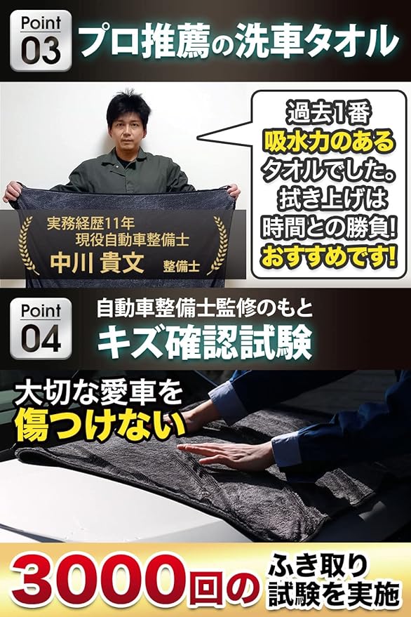 【自動車整備士監修】現役自動車整備士の中川氏が「過去1番の吸水力!一発で拭き上げ可能。拭く手間がかからない」と大絶賛。プロも推薦洗車タオルです。