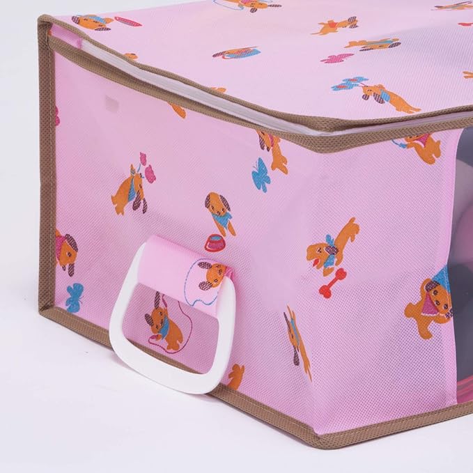 ●小さいお子様でも一人で持てる、軽くて持ち手も付いたおもちゃ収納ケース。ピンク地にかわいいワンちゃんの柄で楽しくお片付け!