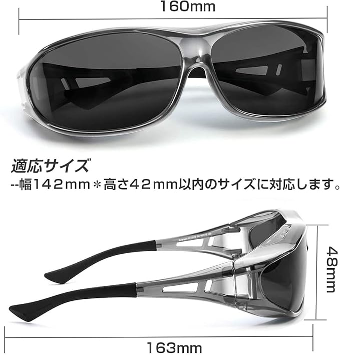 【メガネの上から掛ける】:メガネをかけたままサングラスが着用できる!おしゃれなオーバーグラスです。便利性アップ!対応する眼鏡サイズ(約):横幅:142mm 縦幅:42mm以下。また、メガネを使用しなくても完全にいい感じになる偏光サングラスです。#ご使用のメガネの大きさ・形状に合せてお選び下さい。