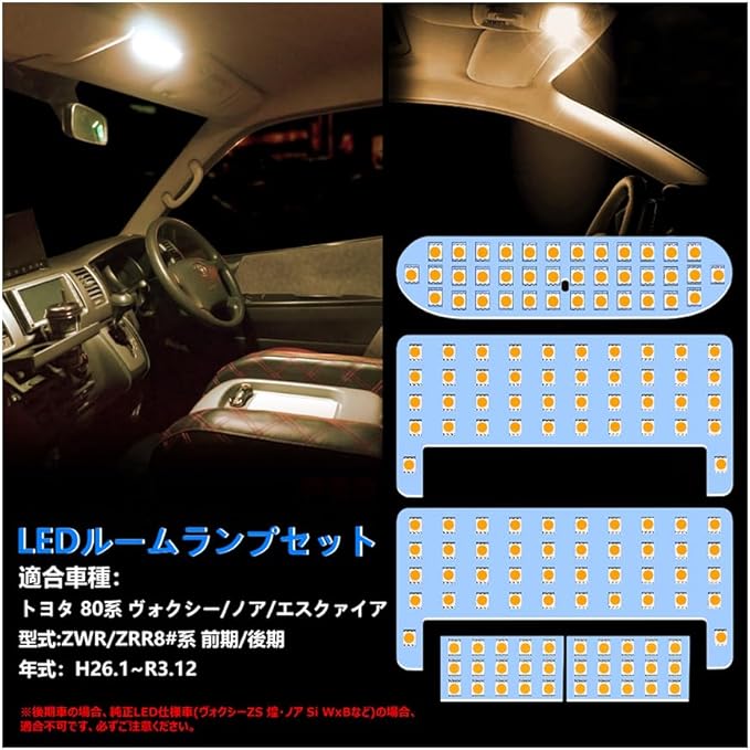 LEDルームランプセット 【適合車種】:ヴォクシー/ノア 80系 エスクァイア ZWR80 ZRR80 前期/後期、年式:H26.1~R3.12 【発光カラー】:電球色 3500K~3800K 【セット内容】:フロントランプ 1、センターランプ 1、リアランプ 1、バニティランプ 2、全5点。ご注意:後期車の場合、純正LED仕様車(ヴォクシーZS 煌・ノア Si WxBなど)の場合、当該LEDは適合不可ですので、別途に[B0BLVGFS94]を検索して、そのLEDルームランプをご注文ください。(ハイブリッド車も同様)。