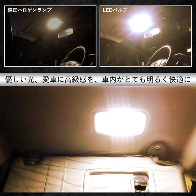 電球色 優しい光:、車内の明るさを求めるために、一つのLEDに三つ発光素子を持った3chip SMDを採用ていますので、驚きほどの明るさ、また、約3500K~3800Kの電球色で車内の高級感を演出した圧倒的な存在感、落ち着いた大人の車内を演出します。