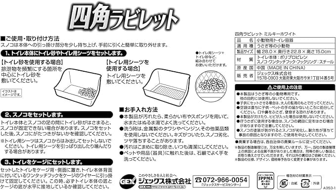ゆったりサイズで安定!寝床&巣箱にも最適な四角タイプトイレ! ドワーフ系、ミニうさぎにも最適。 いたずら防止! 特殊構造のロック式スノコ ケージにしっかり固定! 便利なワンタッチフック付き 清潔!足やお尻が汚れない! 広い網目(1.4cm)でうんちが詰まらない※仔うさぎに使用する場合は、スノコの網目に足を挟む場合があるので注意してください。 トイレサイズ:幅28.0 奥行22.8 高さ15.0cm