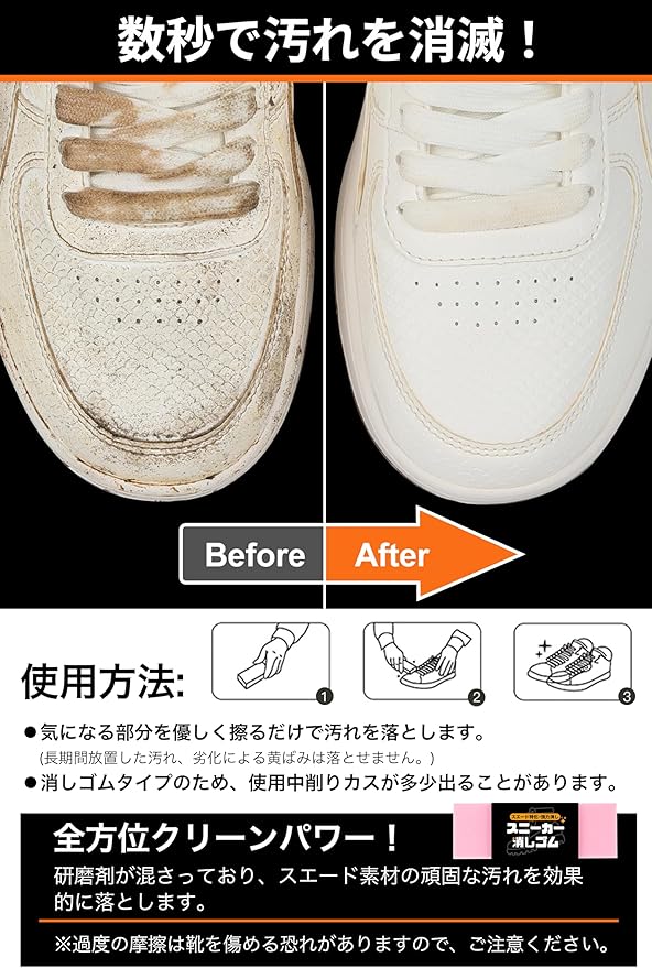 【汚れだけを落とす・スニーカーをキレイに】スニーカー専用の消しゴムを使うと、汚れだけを効果的に吸着し、すぐにキレイにします。靴に優しく、常に美しい状態を保つことができます。汚れを落とすには適度な摩擦が必要ですが、消しゴムタイプのため、削りカスがかなり出ることがあります。※長期間放置した汚れや経年劣化による黄ばみなどは落とせません