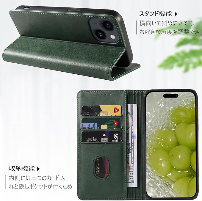 【KWATUNG】iphone 15 ケース 手帳型 レザー アイフォン15ケース 手帳型 軽量 薄型 マグネット式 iphone15ケース手帳型 カード収納 スタンド機能 iphone 15 手帳型 ケース 衝撃吸収 落ち着いた色 iphone 15 スマホケース アイフォン15手帳型ケース 放熱性 折りたたみ 6.1インチ【グリーン】
