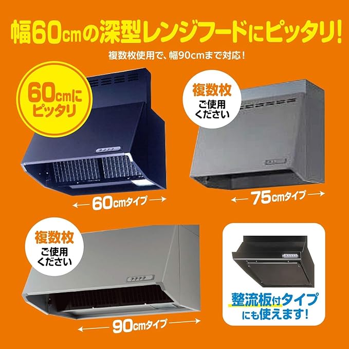 60cm幅の深型レンジフードにピッタリのサイズです。2枚使用すれば75〜90cm幅の深型レンジフードにも使えます。