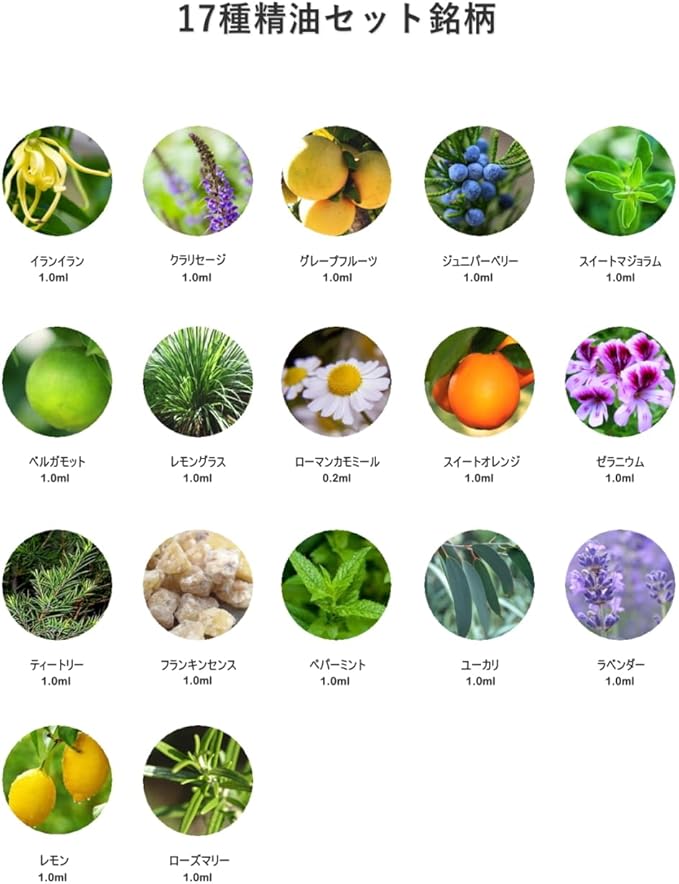「AEAJアロマテラピー検定 1級・2級対象主要17種精油セット」のエッセンシャルオイルは、基本的な香りが揃っていますので、どのような香りか知識を得たい方や、アロマテラピーをこれから楽しみたい方にもおすすめです。