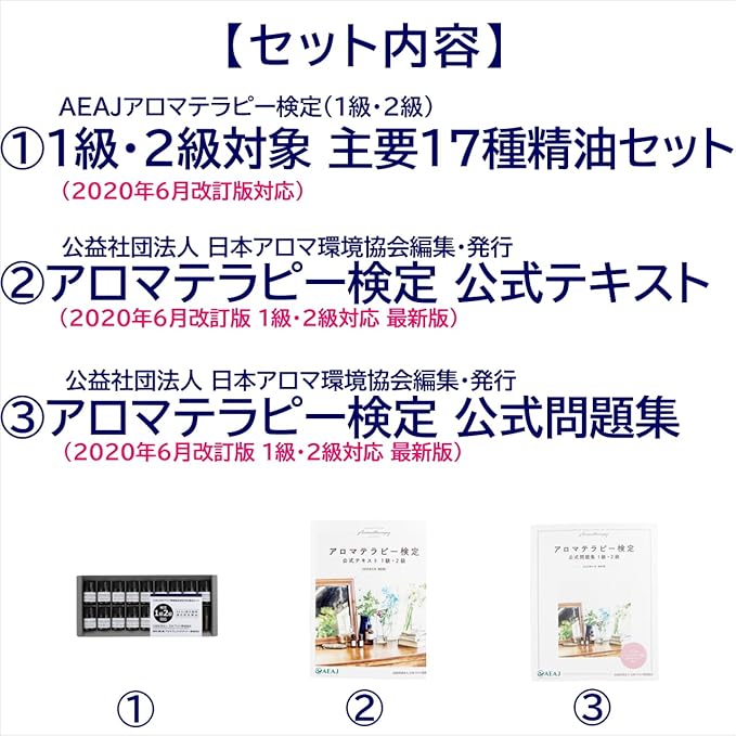 [セット内容] 公式テキスト(公益社団法人 日本アロマ環境協会編集・発行 2020年6月改訂 最新版)、公式問題集(公益社団法人 日本アロマ環境協会編集・発行 2020年6月改訂 最新版)、エッセンシャルオイル 17種(AEAJアロマテラピー検定1級・2級対象主要銘柄)