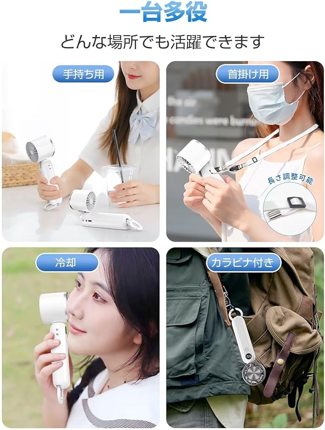 【ストラップ付き・カラビナ付き、首掛け・卓上として使用可能】本品はストラップが付属しています。さらに扇風機のヘッド部は90 調整可能で、首掛け扇風機または卓上扇風機として使用することが可能です。カラビナ付きで、カバンなどに掛けることが可能で、収納が便利です。