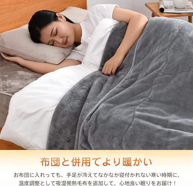 【サイズ・重量】シングル・140X200cm/1.9kg 【素材】表生地:ポリエステル100%(フランネル)裏生地・えり部分:ポリエステル60%+レーヨン40%(吸湿発熱繊維)詰め物:ポリエステル100%(吸湿発熱加工わた入り)