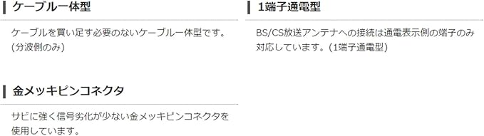 特徴 1本のアンテナケーブルを地デジとBS/CSに分けて接続可能。SMTによる精密設計を施した4K8K対応のTV接続用アンテナ分波器。