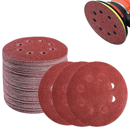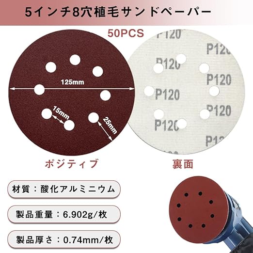 5インチ8穴植毛サンドペーパー材質:酸化アルミニウム;製品重量:6.902g/枚;製品厚さ:0.74mm/枚;丸型直径125mm,50PCS,カラー: レッド。